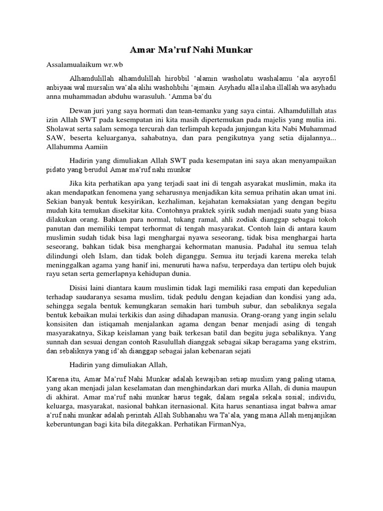 Agama islam adalah agama yang sangat memperhatikan penegakan amar maruf dan nahi munkar. Kewajiban menegakkan kedua hal itu adalah merupakan hal yang sangat penting dan tidak bisa ditawar bagi siapa saja yang mempunyai kekuatan dan kemampuan melakukannya. Untuk selengkapnya marilah kita simak bersama contoh pidato tentang amar makruf nahi munkar berikut ini. Makalah amar maruf nahi munkar disusun oleh. Amar maruf nahi munkar adalah sebuah kewajiban seorang muslimcontohnya sudah di sebutkan dia atas. Kita harus senantiasa ingat bahwa amar maruf nahi munkar adalah.