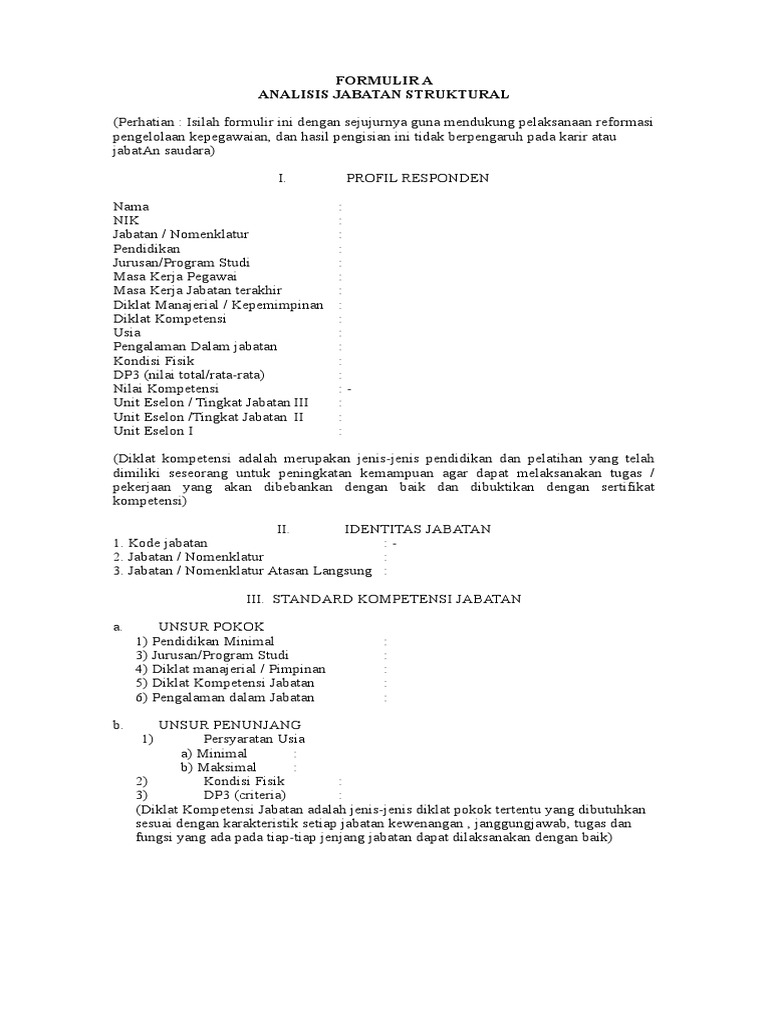 Pedoman analisis jabatan struktural rumah sakit muhammadiyah kalitidu. Form anjab penyempurnaan.