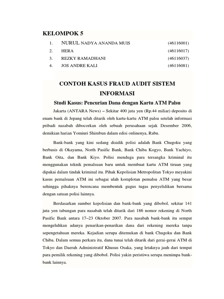 Contoh kasus audit sistem informasi studi kasus. Sumatera post news sekitar 500 juta yen rp44 miliar deposito di enam bank di indonesia telah ditarik oleh kartu kartu atm palsu setelah informasi pribadi nasabah dibocorkan oleh sebuah perusahaan sejak januari 2007. Pencurian dana dengan kartu atm palsu. Tujuan audit sistem informasi. Audit sistem informasi pengertian menurut para ahli tahapan tujuan jenis resiko untuk pembahasan kali ini kami akan mengulas mengenai audit sistem informasi yang dimana dalam hal ini meliputi pengertian menurut para ahli tahapan tujuan jenis dan resiko nah agar lebih dapat memahami dan dimengerti simak ulasan selengkapnya dibawah ini. Setelah mengetahui pengertian dari sistem informasi hal selanjutnya yang akan dibahas adalah contoh sistem informasi.