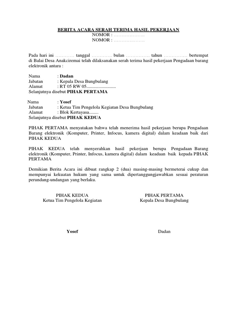 Demikian berita acara ini dibuat pada waktu dan di tempat sebagaimana disebutkan pada bagian awal berita acara ini. 0pekerjaan1 selanjutna untuk melaksanakan serah terima hasil pekerjaan diantara para pihak berdasarkan perjanjian maka para pihak dengan ini sepakat. Contoh berita acara serah terima pekerjaan. Contoh surat berita acara serah terima barang. Surat ini sebaiknya dibuat dalam rangkap 2 dimana masing masing pihak memegang satu rangkap sehingga masing masing pihak memiliki alat bukti hukum yang sah telah dilakukannya serah terima barang tersebut. Berikut informasi sepenuhnya tentang contoh berita acara serah terima pekerjaan proyek doc.