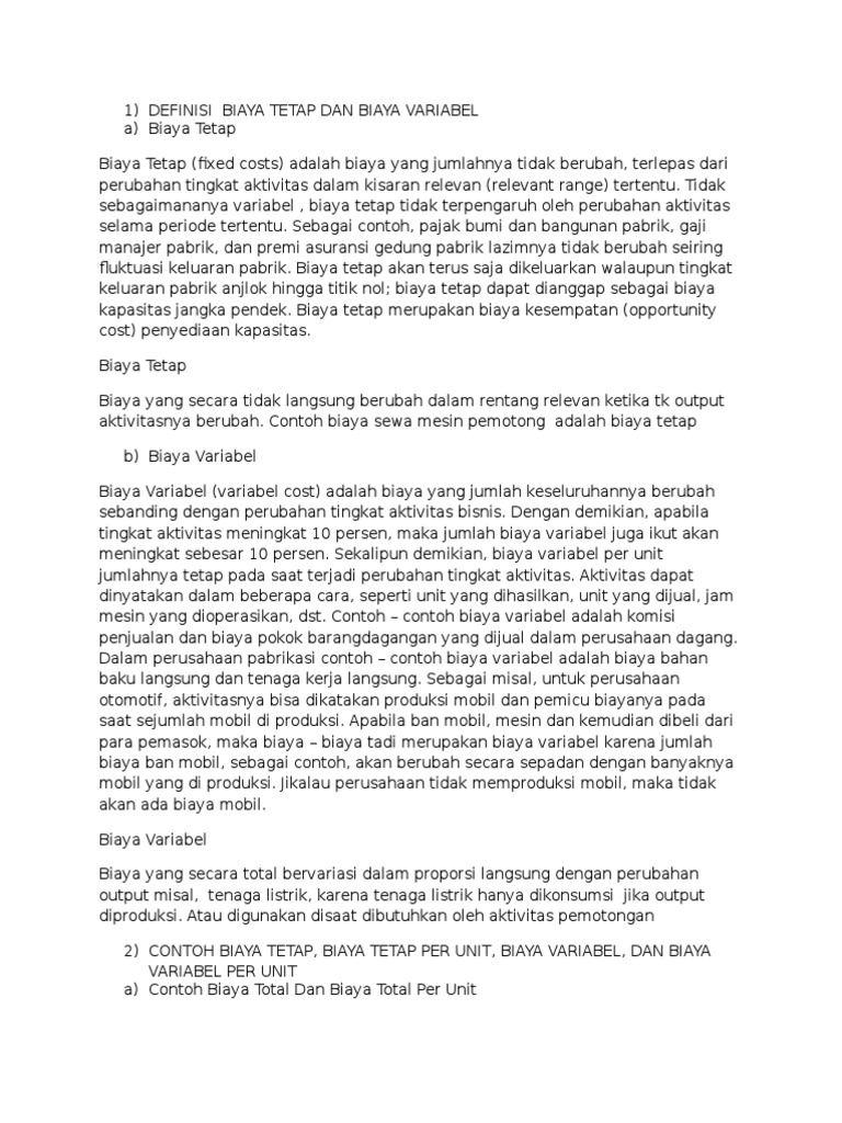 Biaya tetap tidak terpengaruh oleh perubahan perubahan dalam aktivitas operasi sampai pada kondisi tertentu kondisi dimana sesuai dengan kapasitas yang tersedia. Utilitas utility contoh biaya utilitas adalah seperti biaya listrik gas telepon dan sebagainya. Tapi biaya variabel per unitnya tetap. Dalam manajemen keuangan biaya biaya yang dikeluarkan oleh produsen tersebut biasanya dibagi menjadi dua kategori utama yaitu biaya tetap fixed cost dan biaya variabel variabel cost. Biaya ini memiliki elemen variabel tetapi sebagian besar tetap. Biaya tetap fixed cost biaya tetap atau yang disebut juga dengan fixed cost merupakan biaya yang dikeluarkan oleh sebuah perusahaan dalam keadaan konstan atau umumnya senantiasa tidak berubah walaupun mengalami peningkatan maupun penurunan jumlah barang atau jasa yang dihasilkan.