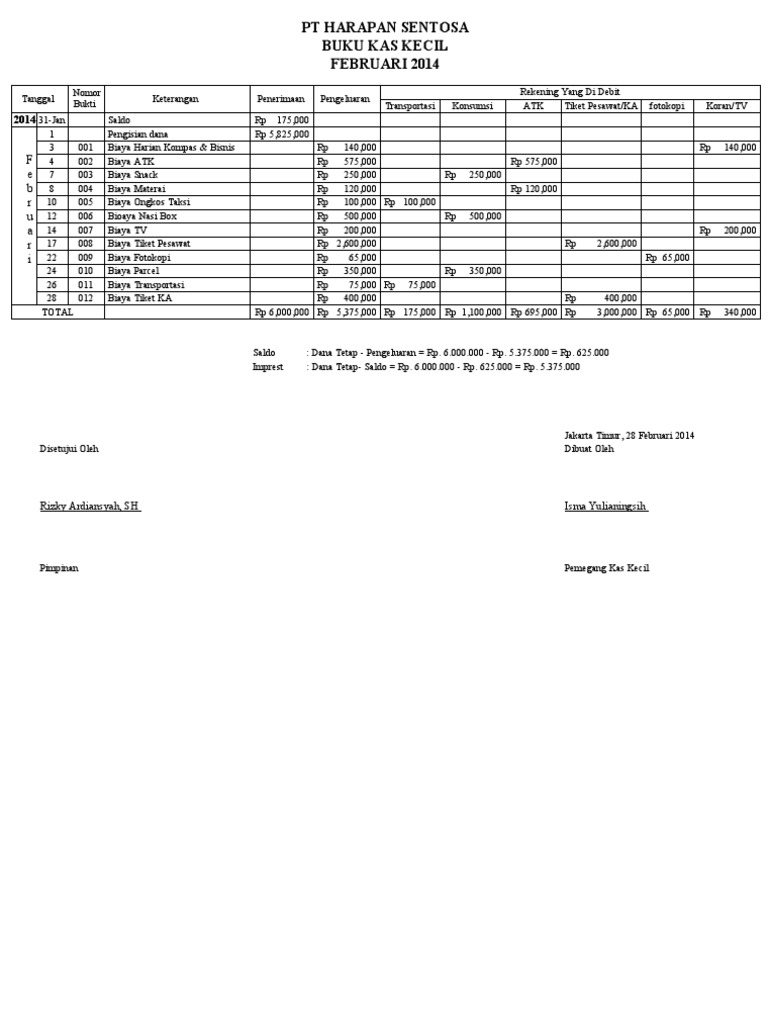 Contoh buku kas kecil. 5 maret 2003. Pembuatan catatan pengeluaran pada buku kas kecil dimana mencatat pembayaran disertai pembuatan bukti pengeluaran kas kecil untuk memperoleh penggantian dengan memperlihatkan bukti pengeluaran kas kecil beserta pendukungnya jika sisa saldo mencapai batas minimum atau titik kritis saldo. Semoga dapat dipahami dan bermanfaat penjelasan mengenai contoh soal dan metode dana kas kecil. Setiap pengeluaran kas kecil harus dicatat dalam bukti pengeluaran kas kecil dan buku kas kecil. Seperti yang telah dijelaskan sebelumnya tentang kas kecil kali ini akan dilanjutkan dengan contoh soal kas kecil metode impress sekilas tentang kas kecil metode impress sistem dana tetap imprest fun system atau sistem dana tetap nama lain dari metode impress adalah metode pembukuan kas kecil dimana jumlah rekening kas kecilnya tidak berubah alias tetap. Jadi buku pengeluarna kas kecil mempunyai fungsi sebagai buku jurnal dan menjadi dasar pembukuan kerekening rekening buku besarkarena pencatatan dilakukan setaip kali terjadi pengeluaran maka rekening kas kecil didebit sebesar uang yang diterima.