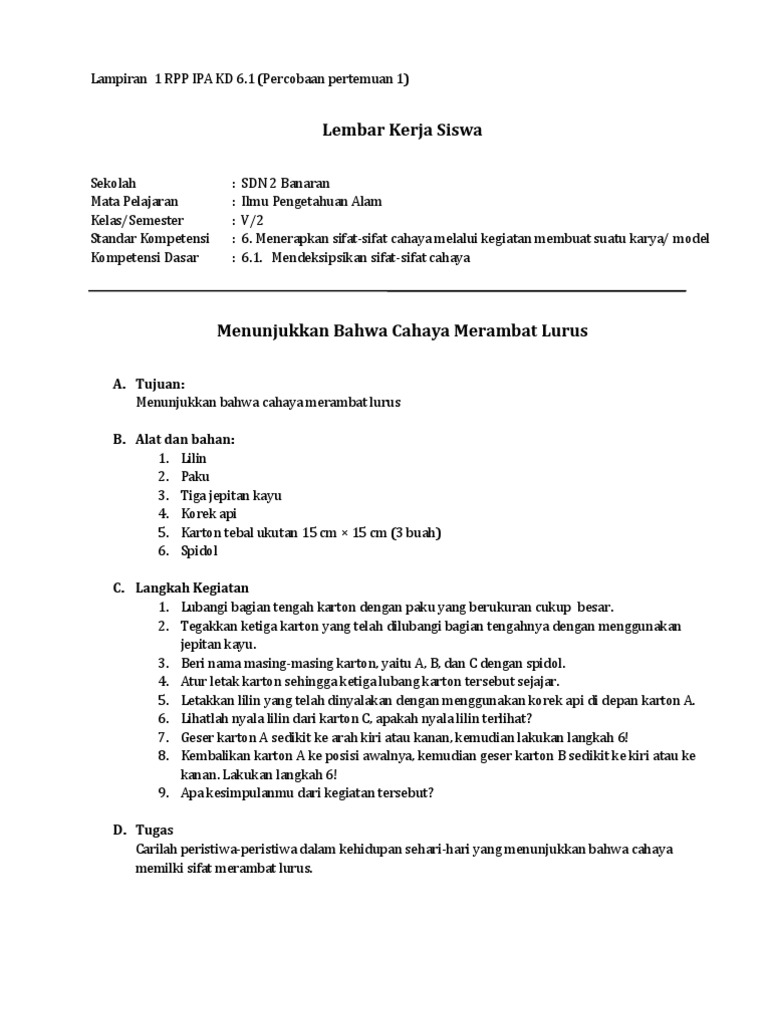 Perlu kalian ketahui bahwa sinat lampu sinar matahari sinar bulan dan sinar lilin merupakan sumbercahaya. Bukti cahaya merambat lurus tampak pada berkas cahaya matahari yang menembus masuk ke dalam ruangan yang gelap. Cahaya senter membentuk garis lurus. Contohnya ialah lampu senter dan lampu sorot kendaraan bermotor. Cahaya memiliki sifat sifat gelombang diantaranya cahaya merambat lurus cahaya dapat dipantulkan dan dapat dibiaskan. Cahaya senter membentuk garis lurus.
