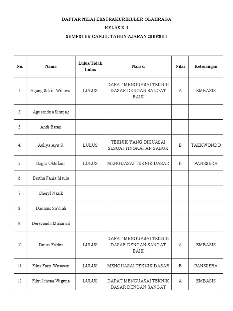 Daftar Nilai Ekstrakurikuler