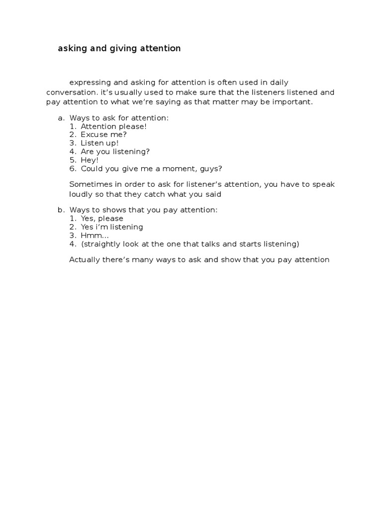 Contoh dialog asking for attention. Adapun beberapa ungkapan yang tergolong sebagai asking for attention antara lain. Expressing attention adalah cara yang digunakan untuk meminta seseorang memfokuskan perhatiannya kepada kita atau sebaliknya kita yang memfokuskan perhatian kepada orang yang sedang berbicara. Contoh dialog expression of asking attention and giving attention. This conversation happened in front of the class. The teacher is explaining the material the students are not paying the teacher explanations. Dalam situasi tertentu seseorang sering meminta perhatian asking for attention dan sebagai lawan bicara yang baik maka akan menunjukkan perhatiannya showing attention.