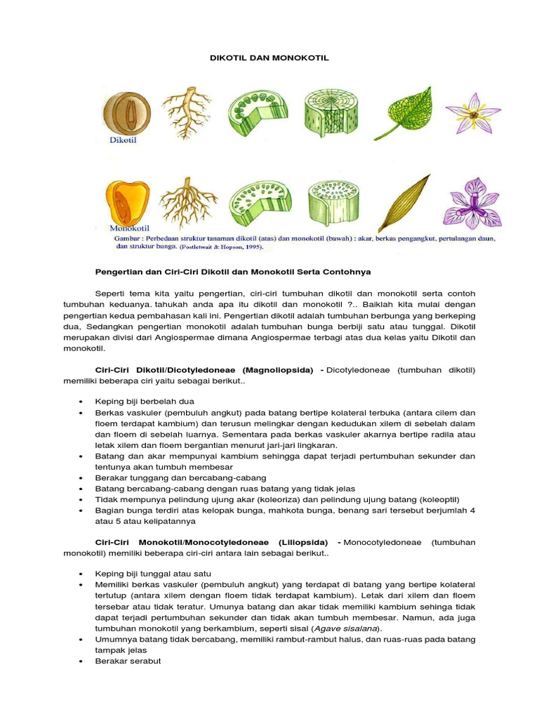 Tumbuhan berdasarkan jumlah keping bijinya dibedakan menjadi 2 yaitu tumbuhan monokotil dan dikotil. Pengertian ciri ciri dikotil dan monokotil serta contohnya seperti tema kita yaitu pengertian ciri ciri tumbuhan dikotil dan monokotil serta contoh tumbuhan keduanya. Berikut contoh tumbuhan dikotil 1pisang 2. Tumbuhan monokotil memiliki satu keping biji yang tidak akan membelah ketika ia berkecambah. Ciri ciri tumbuhan monokotil adalah berkeping satu akar serabut berjaun sejajar dengan tulang daun yang jelas. Tipe buah batu berbentuk segitiga agak bulat atau bulat telur terbalik runcing di pangkalnya dan membulat di ujungnya panjang 25 10 cm.