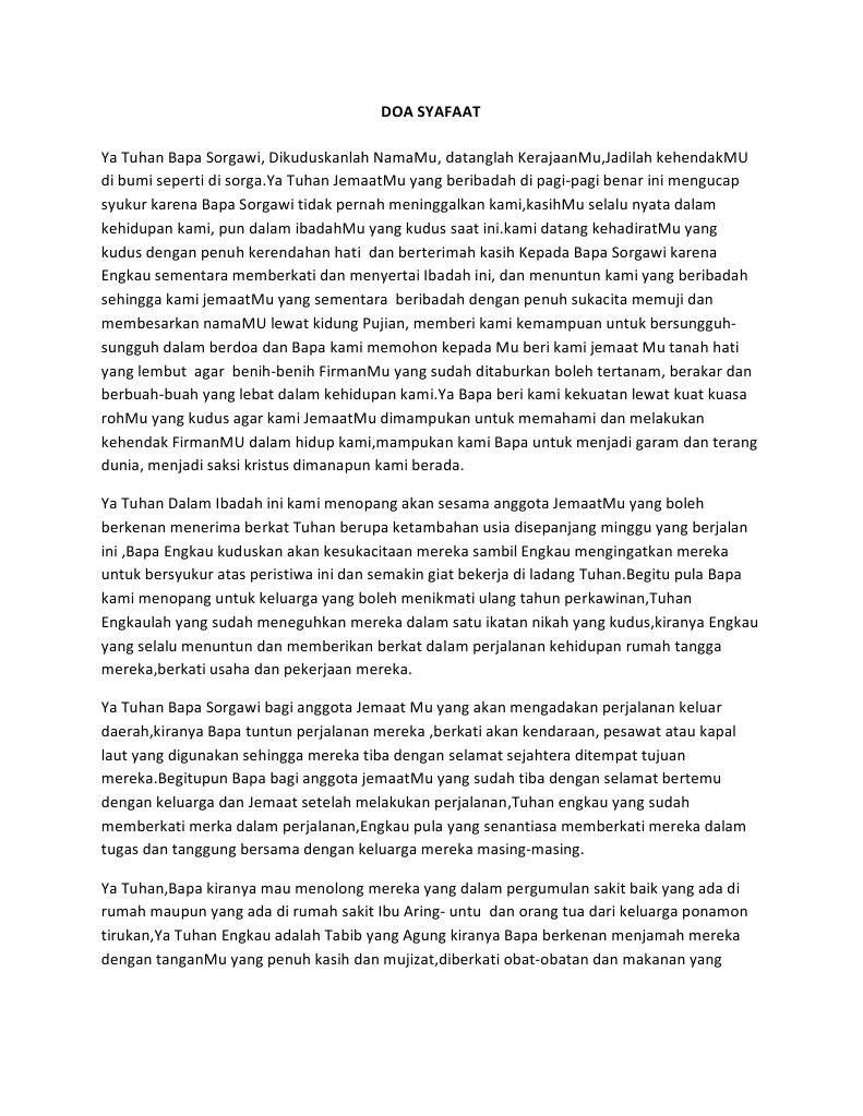 Mulai saat sholat pastikan anda bersyukur sebelumnya tidak langsung berlaku untuk tuhan dan isi syafaat dapat anda atur secara bertahap dan tidak terburu buru. 31 desember 2012 0238 diperbarui. Tarik nafas dan mulai berdoa. Turut juga mendoakan para pejabat yang turut serta bekerja demi kemajuan bangsa. Dan bila melaksanakan ibadah umum maka boleh membaca salah satunya adalah doa syafaat untuk bangsa dan negara. Berkatilah rakyat indonesia dengan segala pekerjaannya yang beragam itu.