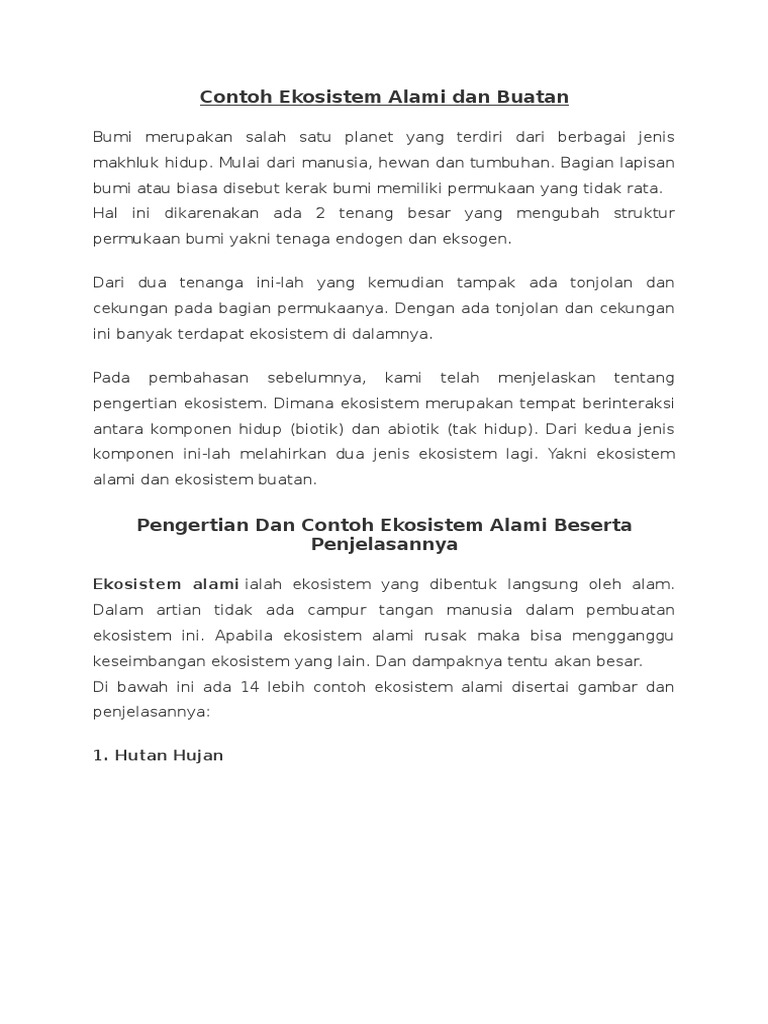 Contoh ekosistem alami dan contoh ekosistem buatan adalah 2 hal yang sering ditanyakan oleh guru kita terkait dengan pembelajaran biologi pada bab ekosistem. Tak sedikit siswa yang masih bingung jika diberi pertanyaan ini. Contoh ekosistem alami dan buatan bumi merupakan salah satu planet yang terdiri dari berbagai jenis makhluk hidup. Baik itu manusia hewan tumbuhan dan juga benda mati lain yang ada pada suatu tempat tersebut. Ekosistem padang rumput ekosistem gurun dan ekosistem hutan hujan tropis. Ekosistem alami ekosistem alami adalah ekosistem yang terbentuk secara alami atau tanpa campur tangan manusia.