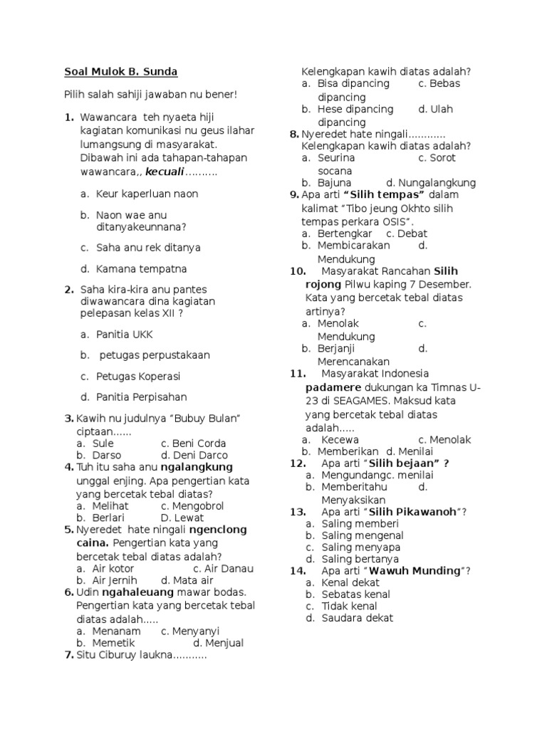 Soal prediksi pat bahasa sunda kelas 7 kurikulum 2013 di handap ieu mangrupikeun soal tes pendalaman materi tpm anu disusun ku tim guru bahasa sunda smp darussalam. Informasi yang saat ini sedang anda cari yaitu esey bahasa sunda tentang keseniandibawah ini telah kami sajikan artikel yang berkaitan dengan esey bahasa sunda tentang kesenian sebagai salah satu referensi yang adan butuhkan silahkan simak dibawah ini. Karangan bahasa sunda tentang kesehatan 3 dan 4 paragraf. Demikian untuk contoh karangan bahasa sunda tentang kebersihan lingkungan sekolah mohon maaf apabila ada kesalahan dalam penulisan karya tulis dalam penggunaan bahasa sunda diatas. Contoh sisindiran bahasa sunda belajar bahasa sunda. Klik di sini untuk informasi file lengkap contoh esey bahasa sunda tentang pendidikan selengkapnya.