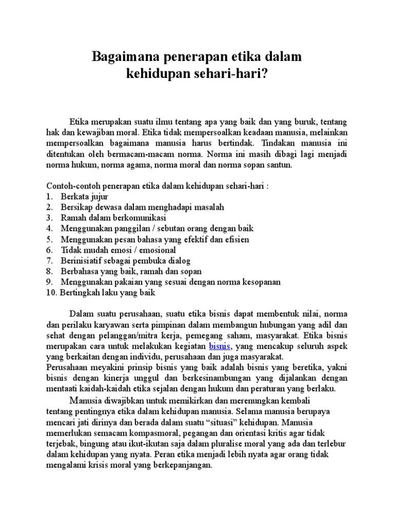Kata etika juga dapat berarti sebuah ilmu yang mempelajari tentang sesuatu yang bernilai baik maupun benilai buruk dan berkaitan dengan hak dan kewajiban moral. Dengan kata lain manusia mempunyai tujuan dalam berkomunikasi dengan sesamanya. Ini adalah contoh etika baik yang dilakukan oleh seorang anak kepada orang tuanya sebelum berangkat ke sekolah. Contoh contoh etika tersebut seringkali kita jumpai di tengah kehidupan dan kebiasaan masyarakat. Seorang anak wajib berperilaku sopan dan hormat kepada orang yang lebih tua terutama kepada orang tuanya sendiri. Dalam artikel ini akan dibahas secara lengkap suatu materi mengenai contoh penerapan pancasila dalam kehidupan sehari hari.