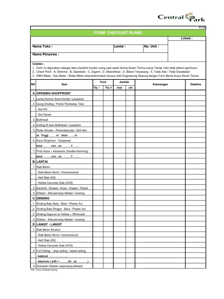 Contoh form checklist bangunan. Saya telah melaksanakan pemeriksaan dan pengecekan sehbungan kualitas bangunan sebelum diserahkan kepada konsumen atas hasil pemeriksaan dan kesepakatan bersama. Aria kami sedang membangun rumah baru dengan system borongan oleh suatu kontraktor. Contoh lembar checklist amdal gedung. Analisis dampak lingkungan amdal merupakan sebuah aturan kajian atau konsekuensi tentang pengambilan keputusan terhadap penyelengaraan usaha terhadap lingkungan atau proyek proyek tertentu seperti konstruksi bangunan atau pengoperasian pabrik yang telah menjadi metode yang semakin umum dan berguna untuk menentukan. Laporan ini di buat oleh konsultan untuk memantau perkembangan progress kegiatan lapangan kegiatan proyek agar selesai tepat waktu. Adapun dari contoh checklist secara umum di buat dapat anda lihat di bawah ini.