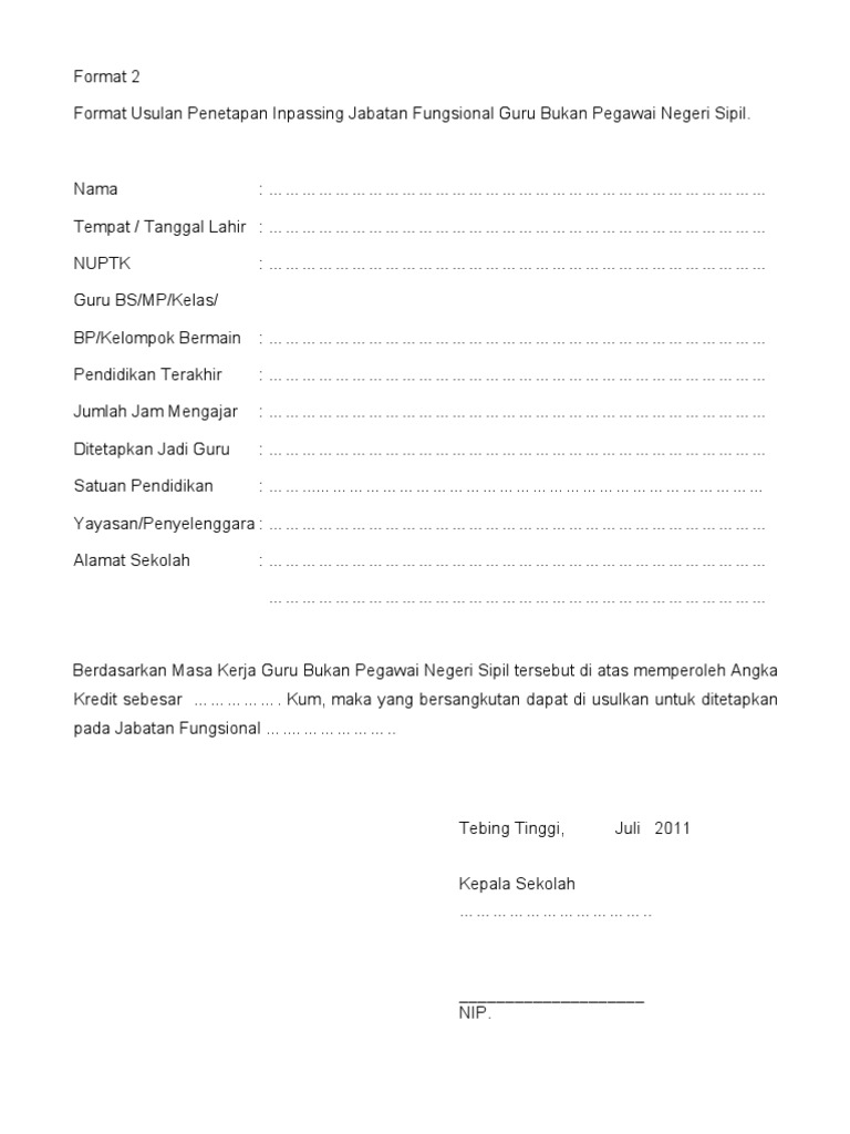 Download dasar dan syarat inpassing klik disini. Entri usulan peserta inpassing 1. Format lampiran usulan inpassing. Download contoh surat pernyataan pemenuhan jam. Download format lampiran 2a dan 2b klik disisni 3. Surat usulan penyetaraan guru bukan pns inpassing merupakan surat resmidinas berisi usulan dari kepala sekolah kepada direktur jenderal dikdas kemdikbud agar guru bukannon pns yang diusulkan mendapat kesetaraan jabatan dan pangkat seperti guru yang sudah menjadi pnssurat tersebut ditujukan bagi kepala sekolah untuk mengusulkan mengajukan merekomendasikan guru bukan pns di sekolahnya.