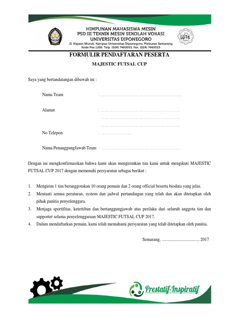 Biaya pendaftaran sebanyak rp. Discover everything scribd has to offer including books and audiobooks from major publishers. Technical meeting diadakan pada tanggal 8 april 2017 pada pukul 1000 wib wajib. 10 contoh kalimat homonim beserta arti katanya semoga dengan adanya contoh formulir dalam bentuk tersebut bisa membantu anda untuk menyelesaikan apa yang sedang anda cari cari. Doc formulir pendaftaran anggota gerakan pramuka emma contoh formulir registrasi anggota pramuka baru smp pilpay. Formulir pendaftaran peserta futsal fik cup 2017 saya yang bertanda tangan dibawah ini.