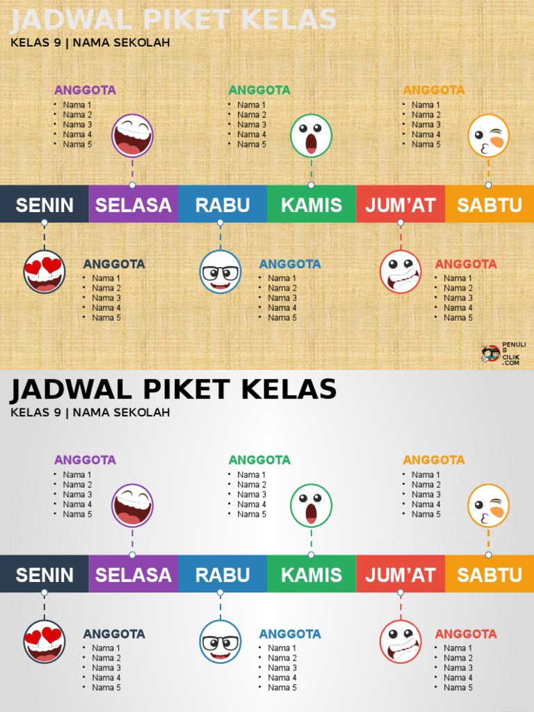 Berikut ini saya poskan contoh desain untuk jadwal regu piket dan struktur organisasi kelas yang biasa dipasang di. Tutorial membuat jadwal pelajaran lucu unik. Download template jadwal piket kelas contoh jadwal piket kelaspptx downloaded 15922 times 224 kb. Sebelum membuat jadwal piket kelas tentunya seluruh siswa yang ada di kelas harus dicatat terlebih dahulu agar semua siswa mendapatkan tugas di hari hari selanjutnya. Hasil sederhananya seperti gambar dibwah ini. Contoh desain jadwal pelajaran super.