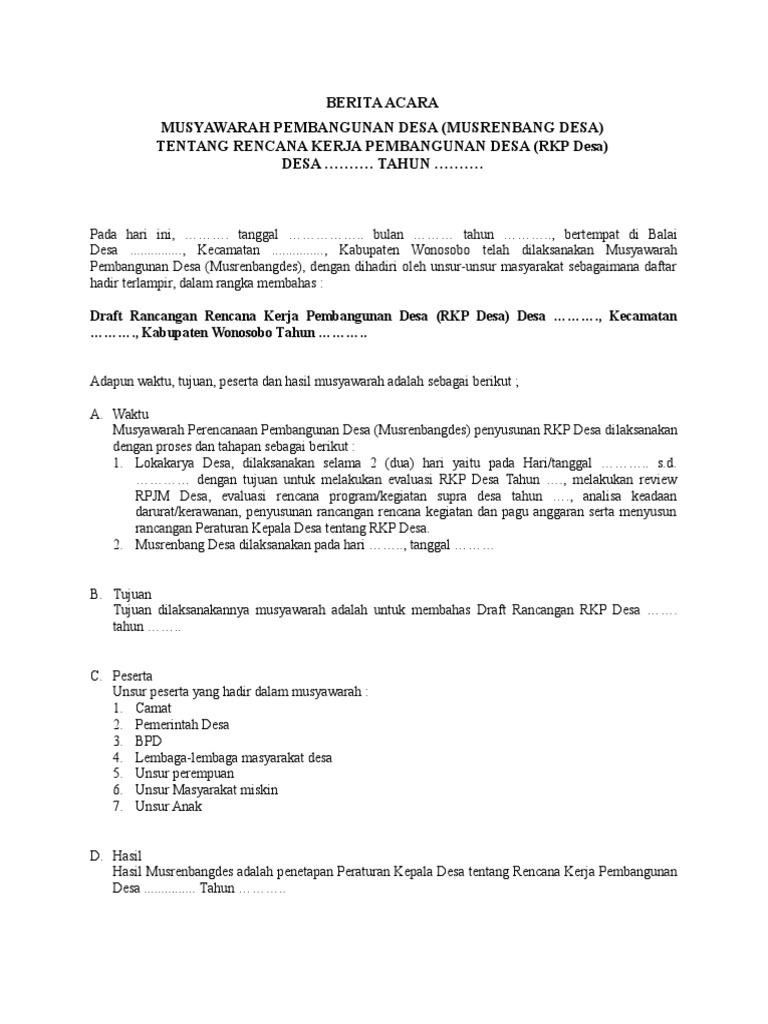 Contoh berita acara musyawarah desa berkaitan dengan pelaksanaan program pembangunan infrastruktur perdesaa n tahun 2013 di desa klampisan kecamatan kandangan kabupaten kediri provinsi jawa timur maka pada hari ini. Atau bahasa ibunya adalah rapat kampung dimana memang haruslah dibuat berupa notule yang akan mengabarkan lokasi dan tempat berlangsung acara dan dalam rangka apa acara resebut di buat. 2 penyusunan daftar prioritas masalah desa untuk disampaikan di musrenbang kecamatan. Menyepakati prioritas usulan hasil musrenbang desa yang akan menjadi prioritas pembangunan kecamatan. Program dan kegiatan yang dibahas dan disepakati meliputi program dan kegiatan yang menjadi urusan wajib dan pilihan sesuai fungsi skpdgabungan skpd dengan mengacu kepada standar pelayanan minimal. Musrenbang harus dipandang sebagai saluran resmi yang dipersiapkan untuk mengkanalisasi aspirasi masyarakat dalam rangka memperoleh akses yang memadai dalam kebijakan penganggaran pembangunan.
