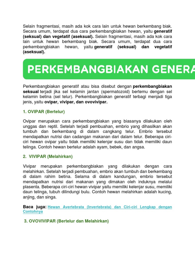Contoh hewan yang berkembang biak dengan fragmentasi. Contoh hewan melahirkan adalah singa sapi anjing dan kucing. Untuk diambil daging dan telurnya yang dimanfaatkan untuk dikonsumsi manusia. Fragmentasi adalah pemotongan atau pemisahan anggota tubuh pada hewan tertentu untuk tujuan perkembang biakan dimana bagian yang terpotong tersebut masing masing tumbuh menjadi organisme baru yang utuh. Contoh hewan yang berkembang biak dengan ovipar. Asalnya dari kaata ovum telur. Masing masing fragmen ini berkembang menjadi dewasa tumbuh menjadi individu dewasa yang merupakan klon dari organisme asli.