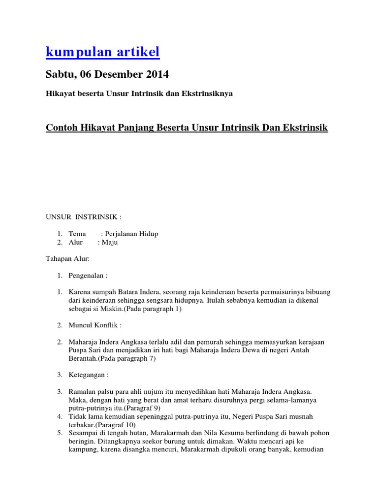 Contoh hikayat singkat beserta unsur intrinsiknya. Contoh hikayat singkat beserta unsur intrinksinya. Contoh hikayat kerajaan pendek lucu singkat beserta unsur intrinsiknya. Pengertian hikayat hikayat adalah karya sastra klasik yang mengisahkan lengkap tentang kekuatan kesaktian serta mukjizat. Hikayat ini mempunyai unsur unsur seperti alur tema penokohan sudut pandang semua itu merupakan unsur unsur hikayat. Koda yaitu nilai atau hikmah yang dapat diambil dari cerita hikayat tersebut. Alasan kalian utuk mencari contoh hikayat beserta unsur intrinsik dan unsur ekstrinsiknya pastilah sangat beragam entah itu merupakan tugas dari sekolah yang diberikan oleh guru kalian kebutuhan dalam penelitiantugas kuliah ataupun kalian hanya iseng iseng saja mencarinya di kolom pencarian mbah google untuk menghabiskan waktu luang kalian.