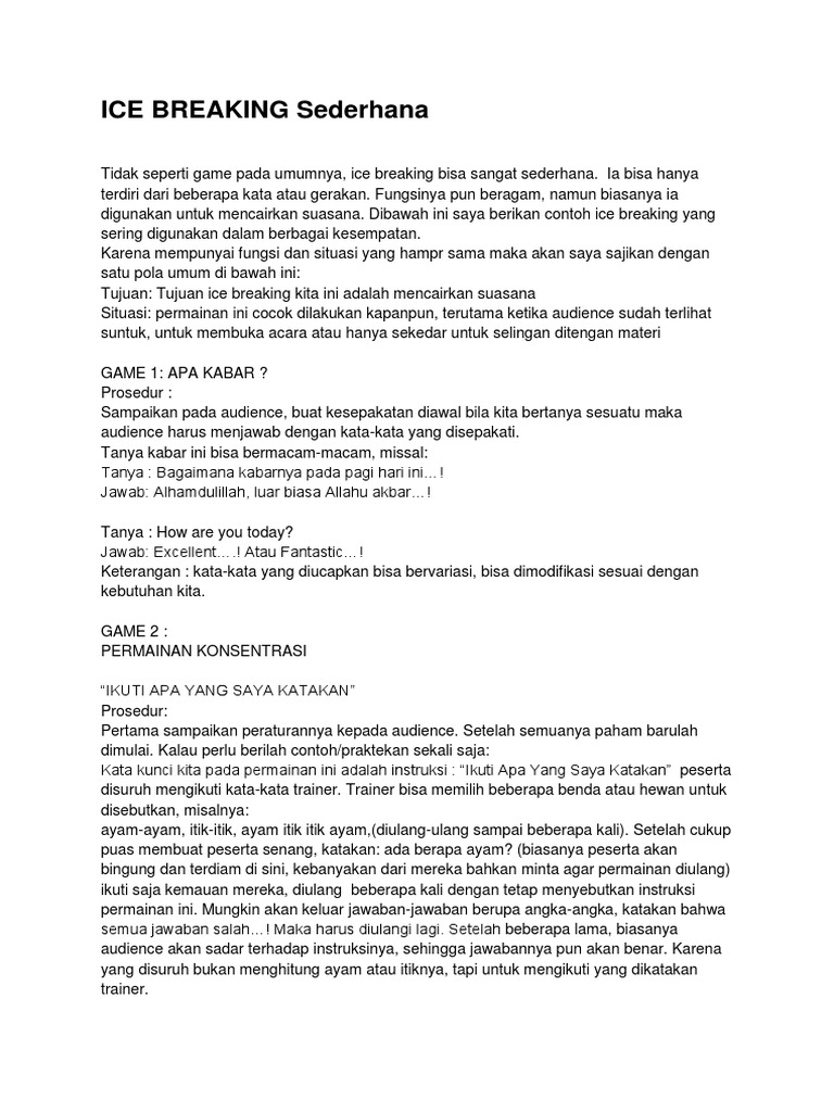 Contoh ice breaking sederhana. Dua pernyataan harus benar dan yang satunya lagi adalah kebohongan. Secara istilah ice breaking bisa dimaknai sebagai suatu kegiatan yang umumnya berbentuk permainan untuk memecahkan kebekuan dalam sebuah pertemuan misalnya seperti seminar ceramah presentasi pelatihan dan kegiatan public speaking lainnya. Tapi menurut pendapat saya no 12 bisa dikerjakan jika telah menyelesaikan no 10 seperti intruksi di no 11 sementara no 10 tidak dikerjakan jadi no 12 juga tidak bisa dikerjakan. Karena ice breaking ini bukan bukan ciptaan saya jadi saya tidak bisa menjawab dengan pasti pertanyaan mbak sani. Contoh ice breaking sederhana dan seru by syamsul hadi 20 jun 2016 1 comment namun kebanyakan para pemateri guru sering kali tidak tahu apa saja ice breaking yang tepat untuk membuat suasana menjadi hangat dan meriah sehingga menumbuhkan semangat bagi penerima materi. Dibawah ini saya berikan contoh ice breaking yang sering digunakan dalam berbagai kesempatan.