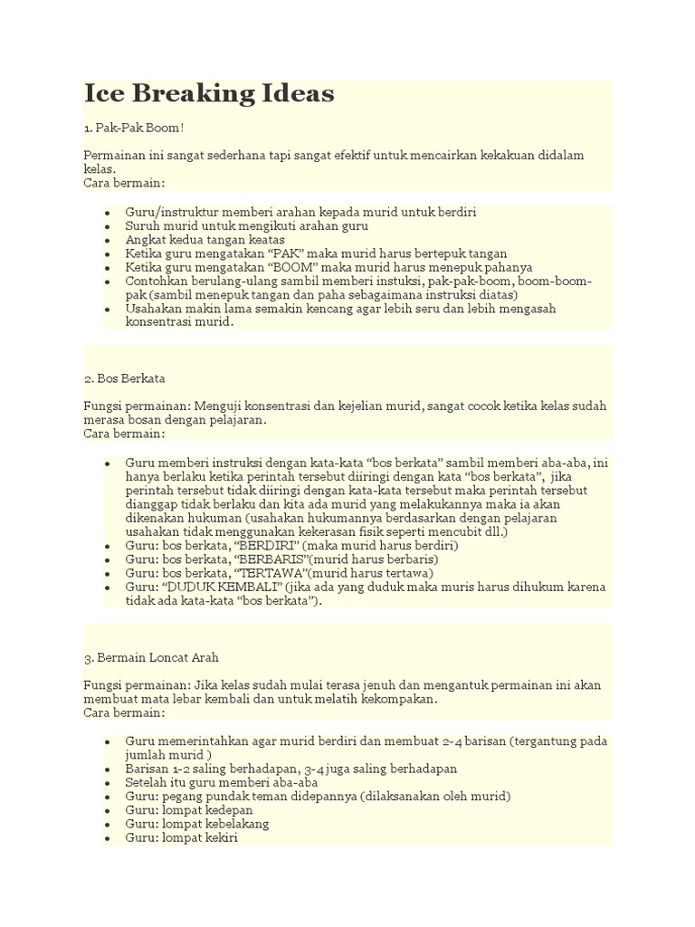 Kegiatan ini biasanya berupa permainan games sederhanaselain pemateri mc juga bisa memimpin ice breaker. Contoh ice breaking sederhana. Dua pernyataan harus benar dan yang satunya lagi ialah kebohongan. Ia bisa hanya terdiri dari beberapa kata atau gerakan. Itulah 30 contoh game ice breaking lucu permainan ice breaker di kelas ice breaking sederhana dalam ruangan contoh ice breaking lucu contoh permainan ice breaking indoor permainan ice breaker kristen contoh ice breaking motivasi permainan ice breaking melatih konsentrasi contoh ice breaking sederhana yang bisa kamu terapkan atau aplikasikan ketika sedang menjadi trainerpemateri atau. 10 permainan dalam ruangan untuk semua kalangan ice breaking 16092016 banyak sekali murid atau peserta suatu kegiatan seminar yang merasa jenuh dan tidak semangat dalam mengikutinya permasalahannya bukan hanya pada cara penyampaian saja tapi juga ada beberapa faktor permasalahan yang membuat jenuh dan membosakan.