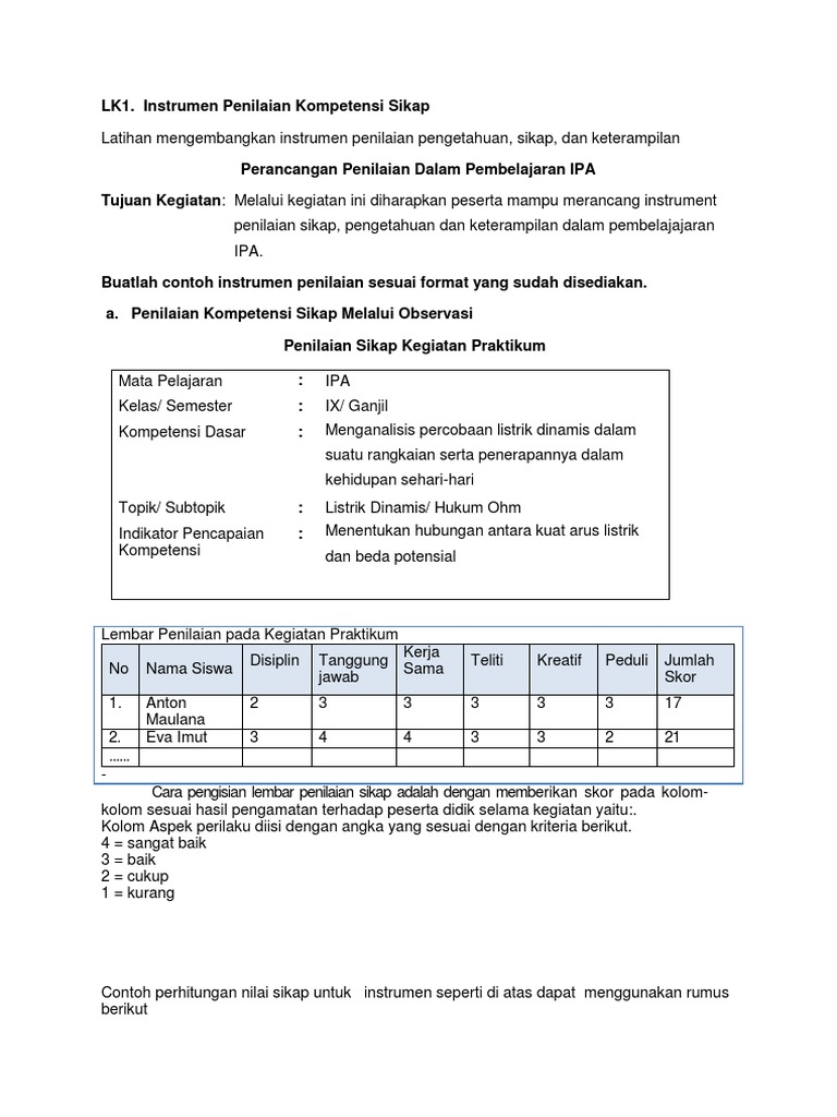 Lembar kerja 4 instrumen penilaian sikap pengetahuan dan ketrampilan penentuan teknik dan bentuk penilaian mata pelajaran. Teknik dan instrumen penilaian. Penilaian otentik yang dimaksud dalam kurikulum 2013 meliputi kombinasi berbagai jenis penilaian yaitu. Contoh rubrik dan lembar penilaian sikap pengetahuan dan keterampilan silahkan klik disini. Secara pleno peserta diklat melaporkan mempresentasikan butir instrumen yang dihasilkan. Dalam kegiatan penilaian psikomotor pengamatan berperan pada saat penilaian yang tidak tertulis.