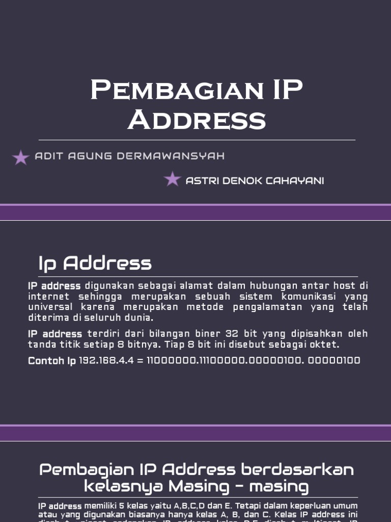Karena ada 4 oktet maka jumlah ip address yang tersedia adalah 255 x 255 x 255 x 255. Sedangkan bit sisanya digunakan untuk grup host pada jaringan dengan range ip antara 224000 239255255255. Ip address sebanyak ini harus dibagi bagikan keseluruh pengguna jaringan internet di seluruh dunia.