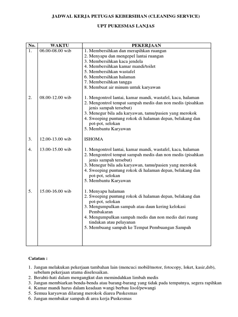 Contoh jadwal kerja cleaning service. Sop standar oprational prosedur cleaning service sop personalia cs cv. Membersihkan wc menyikat lantai dan membersihkan closet yang berkarak membersihkan seluruh perlengkapan wc di lantai 1 dan lantai 2 membersihkan dinding kamar mandi dan menguras bak mandi. Admin blog dapatkan contoh 2019 juga mengumpulkan gambar gambar lainnya terkait contoh surat perjanjian kontrak kerja cleaning service dibawah ini. Pekerjaan rutin harian cleaning service. Penggantian tenaga kerja. Cutiundur diri mutasi penarikan pembinaan pengurangan.