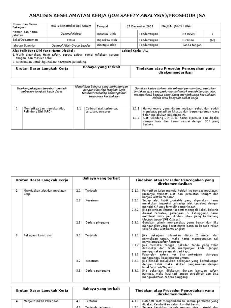 Contoh jsa pekerjaan konstruksi panduan cara membuat job safety analysis cara membuat job safety analysis kecelakaan bukan suatu momen tunggal tapi merupakan hasil dari rangkaian pemicu yang saling terkait yang dipicu oleh kelemahan majikan pekerja mekanisme kerja yang tidak memadai dan tindakan pera pekerja yang tidak aman yang dapat menyebabkan pada turunnya tingkat produktifitas kerja. Contoh jsa atau job safety analysis diperlukan sebagai referensi atau sekedar penambah jsa yang telah kita buat. Job safety analysis adalah sebuah metode yang digunakan oleh pekerja untuk mengidentifikasi bahaya yang ada dalam setiap tahapan pekerjaan dan penentuan pengendalian terhadap bahaya tersebut. Sales online marketing. Cara membuat jsa job safety analysis atau sering disingkat dengan jsa merupakan salah satu jenis prosedur kerja yang banyak digunakan di industri pertambangan perminyakan maupun konstruksi. Setiap pekerjaan memiliki jsa.
