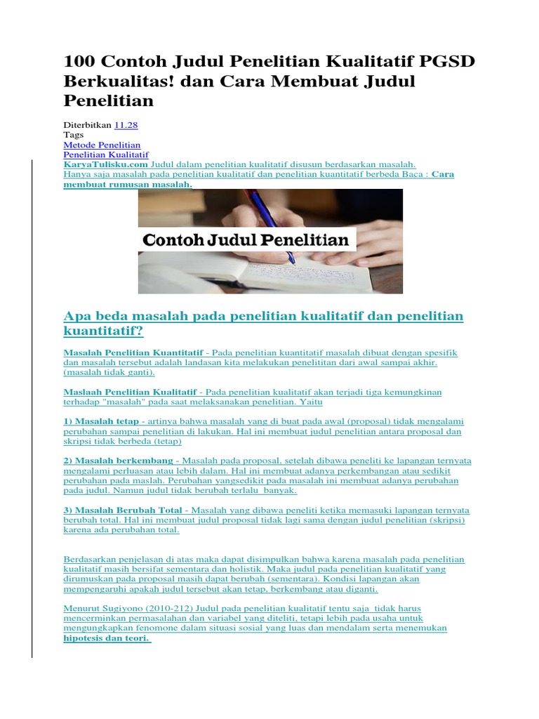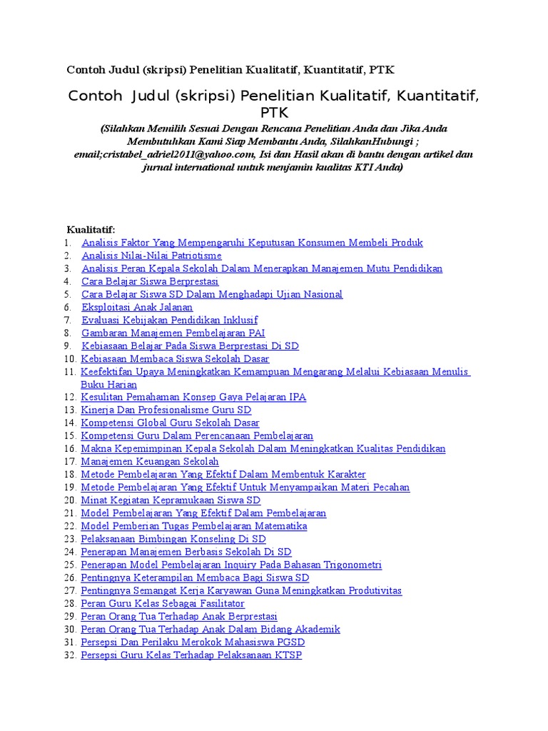 Word lengkap dengan contoh daftar isi cara membuat judul penelitian kuantitatif yang baik dan benar contoh judul penelitian kuantitatif contoh daftar pustaka buku skripsi internet jurnal surat kabar dan makalah pengertian variabel dan contohnya. Dan cara membuat judul penelitian contoh proposal skripsi kuantitatif pengaruh model pembelajaran make a match perhatikan contoh proposal skripsi kuantitatif berikut ini. Artikel ini kami tulis dengan tujuan agar para pembaca mendapatkan inspirasi terkait contoh judul proposal penelitian. Unknown october 28 2019 at 521 am. Download contoh skripsi pendidikan pgsd lengkap file pdf sekali klik 100 contoh judul penelitian kualitatif pgsd berkualitas. Desain proposal yang ditulis juga beragam ada memakai pendekatan kualitatif dan tak sedikit pula yang memakai pendekatan kuantitatif.