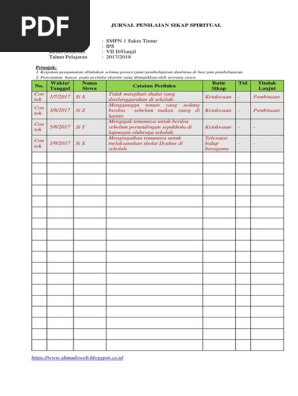 Contoh jurnal perkembangan sikap spiritual sosial pada kurikulum 2013 ajoefahmi 171116. Namun sebelum ke aplikasi kita harus mengisi jurnal dulu dan perhatikan apa saja yang harus ada di dalam nilai sikap sosial dan spiritual. Pendidik dapat memilih jurnal sebagai instrumen penilaian atau instrumen lain yang relevan. Menghargai dan menghayati ajaran agama yang dianutnya sedangkan kompetensi sikap sosial mengacu pada ki 2. Penentuan teknik penilaian sikap harus diikuti dengan penentuan instrumen penilaian. Pada jenjang smpmts kompetensi sikap spiritual mengacu pada ki 1.