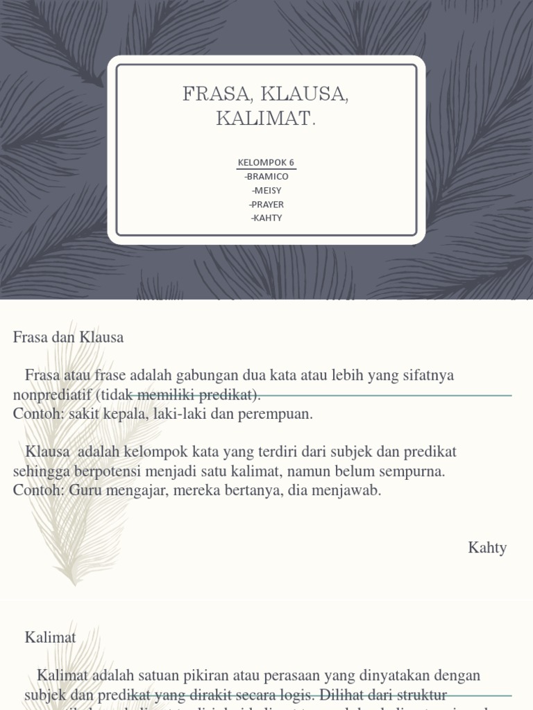 Pada klausa terdapat hubungan antara subjek dengan predikat. Berikut bahasan kita mengenai pengertian ciri jenis dan contoh frasa dan klausa dalam bahasa indonesia. Frasa adalah gabungan dua kata atau lebih yang bersifat nonprediktif artinya tidak terdapat predikat. Sering juga disebut gabungan kata yang mengisi salah satu fungsi sintaksis dalam kalimat.