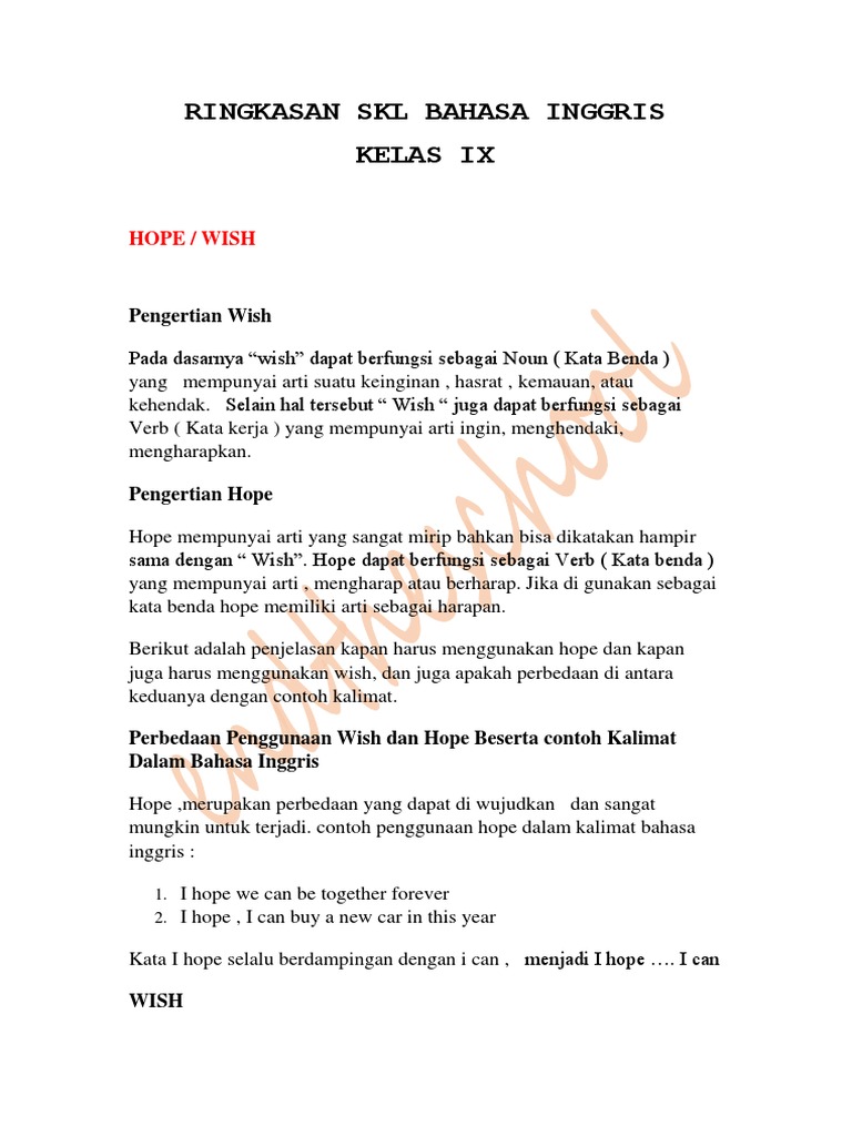 Wish digunakan untuk menunjukan sebuah bentuk pengandaian atau apa yang di ingankan dalam kalimat bahasa inggris meskipun terlihat sebagai bentuk verb atau kata kerja yang sederhana namun wish memiliki aturan dalam menggunakan nya berikut selengkapnya. I wish to dapat mempunyai arti yang sama dengani want to tetapi itu. Kata hope diikuti dengan simple present tense atau simple future tense. Contoh kalimat ungkapan expressing hope dalam bahasa inggris lengkap dengan artinya by om min posted on may 13 2016 pada kesempatan hari ini kita akan membahas bagaimana kita mengungkapan sebuah harapan yang tertuju bisa untuk sesuatu atau seseorang. Ciri ciri kalimat harapan. Subject hopes simple future tense.
