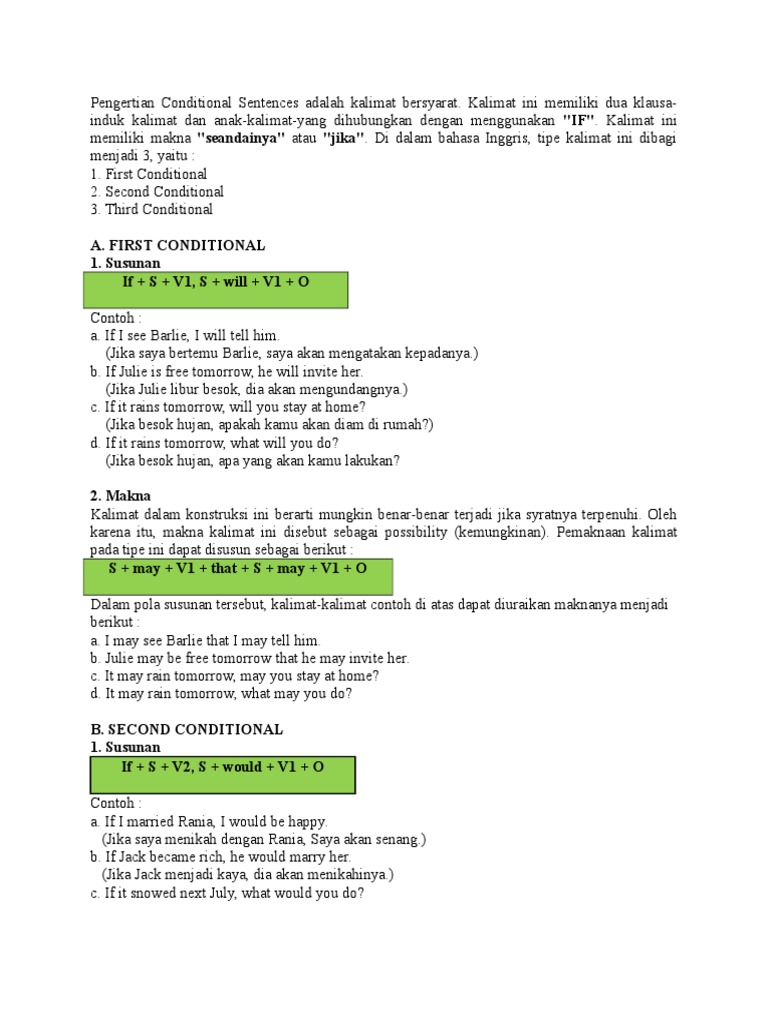 If condition consequence. English admin ada 3 type kalimat pengandaian dalam bahasa inggris. Inilah contoh conditional sentence type 1 2 dan 3 komplit dengan rumus dan artinya. Ketiga type kalimat pengandaian tersebut memiliki pemakaian yang berbeda. Jika aku bekerja keras aku akan memiliki banyak uang. If i work hard i will have a lot of money.