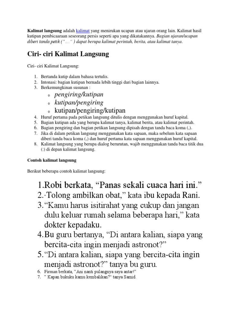 Kutipan langsung dan tidak langsung didalam penyusunan sesuatu seperti. Posting pada sd ditag 20 contoh kalimat berita 5 contoh kalimat langsung bahasa sunda apa yang dimaksud dialog buatlah 5 kalimat tidak langsung kemudian ubahlah menjadi kalimat langsung buatlah 5 kalimat tidak langsung ubahlah menjadi kalimat langsung buatlah kalimat dengan kata gabung sehingga cara langsung dan tidak langsung ciri ciri. Pengertian kalimat langsung dan tidak langsung kalimat merupakan sebuah rangkaian kata yang membentuk suatu kesatuan makna yang bertujuan untuk menyampaikan maksud dan tujuan kepada pendengar atau pembacakalimat langsung dan tak langsung adalah jenis kalimat berdasarkan pengucapannya yang menjadi poin penting dalam proses pembelajaran bahasa indonesia. Oleh itu saya akan memberikan informasi terkait dengan jenis pertanyaan soal bahasa indonesia dengan materi kalimat langsung dan tak langsunginilah garis besar penilaian tentang kalimat langsung adalah sebuah kalimat yang disampaikan langsung. Pada artikel ini kita akan coba mengulas kalimat langsung dan kalimat tidak langsung secara detail. Karya tulis ilmiah makalah laporan dan lainnya itu tidak terlepas dari kutipankarena sesuatu argumen yang terdapat dalam penulisan harus didukung dengan teori yang ada untuk meyakinkan si pembaca tersebut.