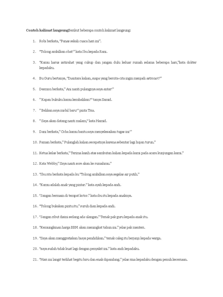 Agar kita dapat memahami kutipan langsung dan tidak langsung berikut disajikan beberapa contoh kutipan langsung dan tidak langsung. Kalimat pentikan di tandai dengan tanda petik b. Sampai sekarang masih banyak yang belum mengerti tentang kalimat langsung dan kalimat tidak langsung. Contoh kalimat langsung dan tidak langsung itu sangat banyak dan sering kita gunakan didalam kehidupan sehari hari. Semoga dengan artikel ini sahabat dapat segera memahami tentang ciri ciri dalam kalimat tak langsung dan langsung. Pengertian kalimat langsung dan tidak langsung kalimat merupakan sebuah rangkaian kata yang membentuk suatu kesatuan makna yang bertujuan untuk menyampaikan maksud dan tujuan kepada pendengar atau pembacakalimat langsung dan tak langsung adalah jenis kalimat berdasarkan pengucapannya yang menjadi poin penting dalam proses pembelajaran bahasa indonesia.