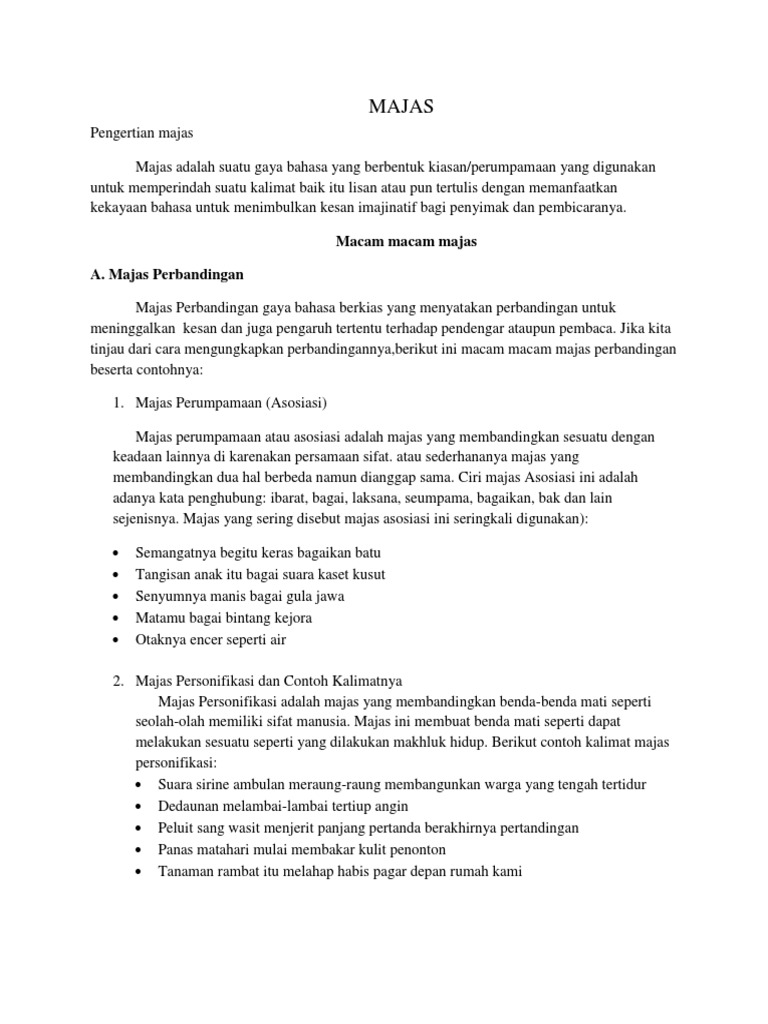 Majas adalah gaya bahasa perumpamaan atau kiasan yang pada umumnya digunakan untuk menguatkan kesan suatu kalimat tertulis atau lisan dan menimbulkan nuansa imajinatif bagi para penyimaknya. Sebelum dimulai kita jelaskan dulu apa itu majas.