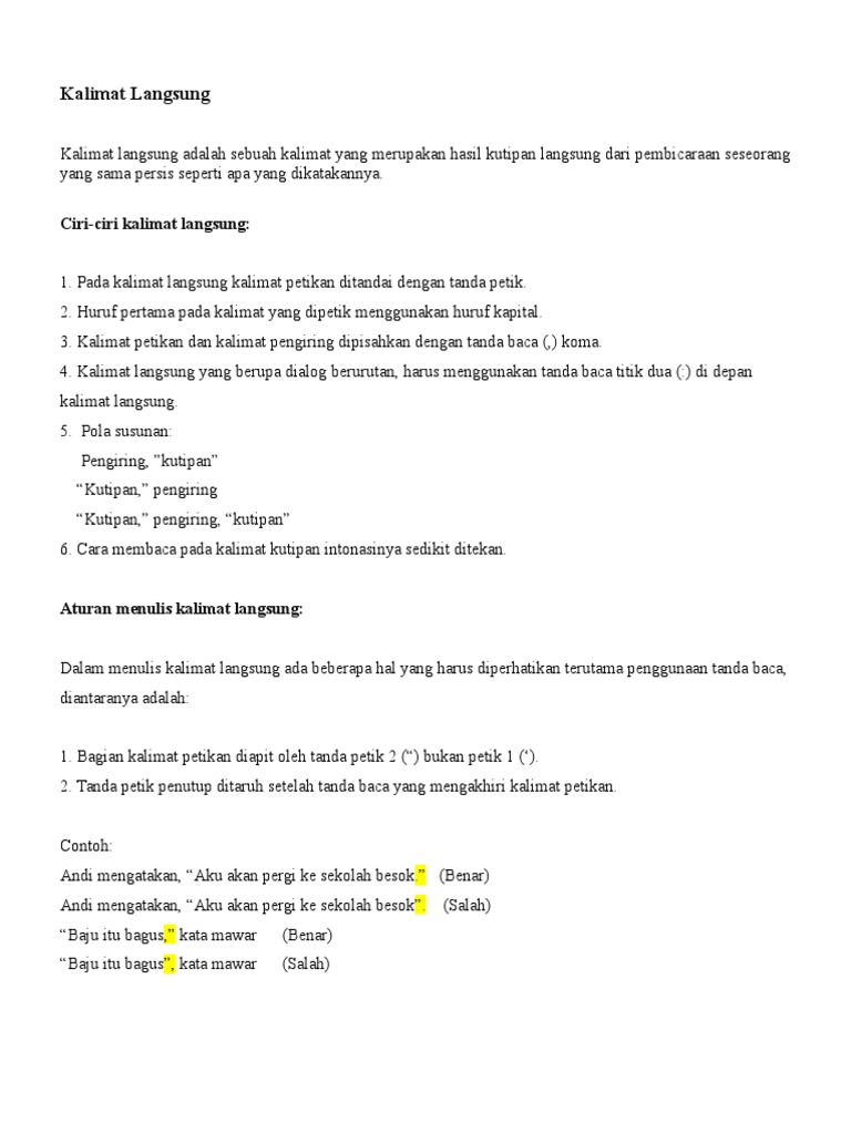 Pengertian kalimat langsung dan tidak langsung kalimat merupakan sebuah rangkaian kata yang membentuk suatu kesatuan makna yang bertujuan untuk menyampaikan maksud dan tujuan kepada pendengar atau pembacakalimat langsung dan tak langsung adalah jenis kalimat berdasarkan pengucapannya yang menjadi poin penting dalam proses pembelajaran bahasa indonesia. Contoh kalimat langsung dan tidak langsung.