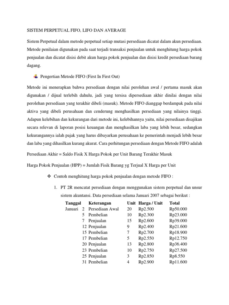 Metode fifo lifo dan average beserta contoh soal dan penyelesaiannya menghitung persediaan dengan metode fifo lifo dan average itu artinya kita akan menyelesaikannya dengan cara menggunakan dua sistem pencatatan persediaan yaitu sistem perpetual dan sistem periodik. Metode sistem pencatatan persediaan periodik dan perpetual pencatatan barang dagang dalam perusahaan dagang dilakukan dengan menggunakan metode pencatatan yang umum digunakan yaitu dengan sistem periodik dan sistem perpetual.
