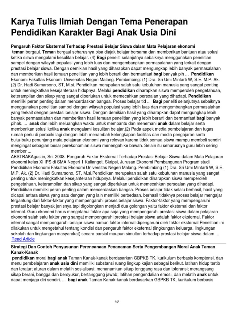 Kalaulah pendidikan karakter adalah hasil dari tindakan moral maka pendekatan pendidikan moral dapat digunakan untuk pendidikan karakter. Contoh karya ilmiah tema pendidikan terbaru 2018 download karya ilmiah tentang pendidikan yang perlu diperhatikan dalam membuat karya ilmiah contoh terbaru karya ilmiah 2016 tema pendidikan karya ilmiah atau tulisan ilmiah adalah karya seorang ilmuan yang ingin mengembangkan ilmu pengetahuan teknologi dan seni yang diperolehnya melalui kepustakaan kumpulan pengalaman penelitian dan. Contoh karya tulis ilmiah tentang pendidikan karakter ini bisa anda download dalam format file doc atau docx microsoft word. Misaln ya para pakar telah mengemukakan berbagai teori tentang pendidikan moral. Berikut ini adalah salah satu contoh makalah karya ilmiah tentang pendidikan terbaru tentang dampak globalisasi terhadap pendidikan 2017 yang dapat kamu download secara gratis. Ada preview nya sebelum kamu download.