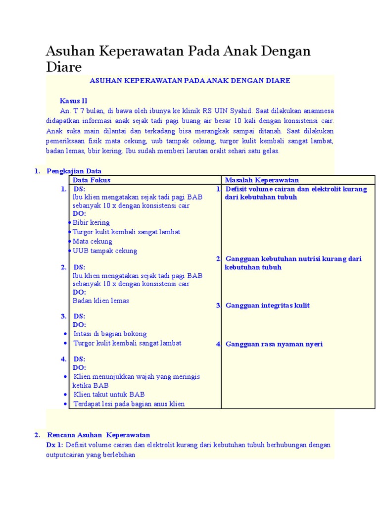 Contoh kasus askep diare pada anak. Di rumah ibu sudah memberi obat berak berak namun tidak berhenti akhirnya membawa anaknya masuk rs. Download file format doc atau docx microsoft word dan pdf. Who world health organization memperkirakan 4 milyar kasus terjadi di dunia pada tahun 2000 dan 22 juta diantaranya meninggal sebagian besar anak anak dibawah umur 8 tahun. Apabila ada warga baru dan ada tamu yang menginap harap lapor pada rtrw. Diagnosa ini diangkat karena bayi tersebut diare disebabkan oleh alergi susu sapi. Dari 6 diagnosa keperawatan tersebut hanya 3 diagnosa yang kelompok temukan pada kasus ini.