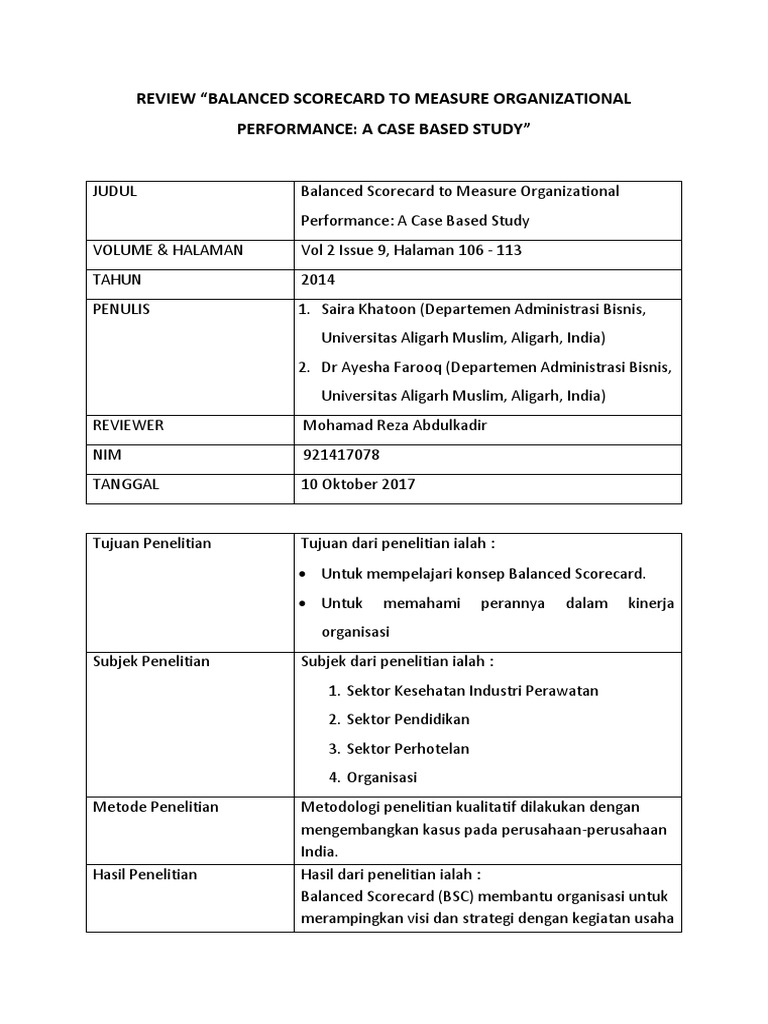Kojo atau sebagai contoh bagi perusahaan lain. Studi kasus pt kojo. Contoh penerapan balanced scorecard pada pt kojo. Balanced scorecard tidak hanya merupakan alat penilaian kinerja tetapi berkembang lebih jauh menjadi suatu sistem manajemen strategis yang membantu menerjemahkan dan mengkomunikasikan visi dan misi organisasi. Pada dasarnya balance scorecard bsc merupakan kartu berimbang yang digunakan sebagai media untuk mengukur aktivitas operasional yang. Pengukuran kinerja dengan balanced scorecard studi kasus pada pabrik gula madukismo dan dimajukan untuk diuji pada tanggal 29 september 2010 adalah hasil karya saya.