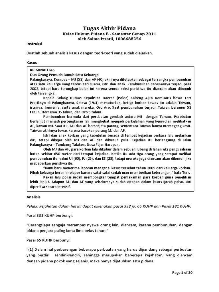 Inilah pembahasan selengkapnya mengenai contoh kasus hukum pidana dan analisisnya. Data full width responsivetrue contoh kasus pidana dan analisisnya lengkap keberadaan hukum pidana materil tidak bisa dipisahkan dari hukum pidana formil keberadaannya hanya dapat dibedakan namun tidak dapat dipisahkan satu sama lain. Medici citra nusantara yang merupakan perusahaan afiliasi bakrie group. Mafia sudah tersebar di semua sektor. Sebuah negara dapat menjalankan yurisdiksi kriminal dan privat terhadap warga negaranya meskipun yang bersangkutan sedang berada di negara lain. Sebagaimana proses beracara dalam hukum acara pidana terdiri dari beberapa tahapan hingga menjadi satu rangkaian.
