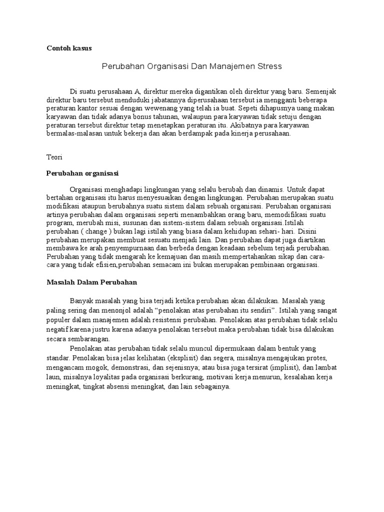 Contoh kasus perubahan organisasi dalam perusahaan. Di sini semua aktivitas organisasi telah habis di outsourcing. Pergantian pemimpin direksi pada pt telkom ditujukan untuk memberikan semangat baru bagi bawahan dan untuk menciptakan ide ide baru inovasi melalui gaya kepemimpinan yang baru dari pemimpin tersebut. Oleh sebab itu dalam makalah ini akan membahas mengenai perubahan organisasi yang lebih mendalam. Karena sasaran diturunkan dari strategi organisasi secara keseluruhan logis kalau strategi dan struktur harus terkait erattepatnya struktur harus mengikuti strategijika manajemen melakukan perubahan signifikan dalam strategi organisasinya struktur pun perlu dimodifikasi untuk menampung dan mendukung perubahan inisebagian besar kerangka strategi dewasa ini terfokus pada tiga dimensi. Satu satunya yang tersisa dalam organisasi adalah sekelompok kecil eksekutif dan sebuah kantor dengan beberapa ratus pegawai. Karena ketika atmosfir kompetisi dimulai maka masing masing divisi pasti akan memiliki rasa bangga dan semangat untuk menunjukan bahwa divisinya yang paling baik ditambah lagi dengan diberikannya reward atas.