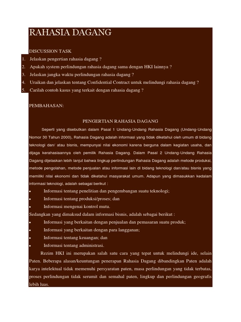 Apengertian rahasia dagang rahasia dagang adalah informasi yang tidak diketahui oleh umum di bidang teknologi dan atau bisnis dimana mempunyai nilai ekonomis karena berguna dalam kegiatan usaha. Rahasia dagang itu berbeda dengan hak paten. Contoh kasus hitachi digugat soal rahasia dagang bisnis indonesia suwantin oemar 21 oktober 2008. Coca cola dan pepsi cola adalah contoh contoh dari sekian banyak pelaku industri makanan dan minuman berskala internasional yang memanfaatkan sistem perlindungan rahasia dagang untuk melindungi formula resep inovatif mereka. Pt basuki pratama engineering mengajukan gugatan ganti rugi melalui pengadilan negeri bekasi terhadap pt hitachi constructuin machinery indonesia sekitar rp127 miliar karena diduga melanggar rahasia dagang. 30 tahun 2000 tentang rahasia dagang uu rahasia dagang atau uurd.