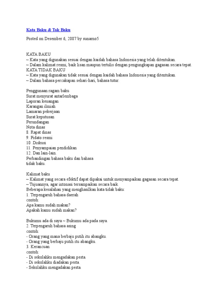Berikut adalah contoh kata baku dan tidak baku terlengkap yang disusun secara alfabetis dari a z kata lengkap di sini sekadar doa semoga pembaca berkenan melengkapinya karena sejatinya tak ada yang benar benar lengkap yang ada adalah usaha. 11 dan lain sebagainya. Kalimat baku dan tidak baku kalimat baku pengertian tidak baku ciri penyebab dan contoh dalam hal ini kalimat baku merupakan suatu kalimat yang sesuai dengan aturan aturan atau kaidah pos pos terbaru. Kata tidak baku adalah kata yang tidak sesuai dengan kaidah bahasa indonesia. Saya mohon izin karena tidak dapat menghadiri rapat. 1 pemakai bahasa tidak mengetahui bentuk penulisan dari kata kata.