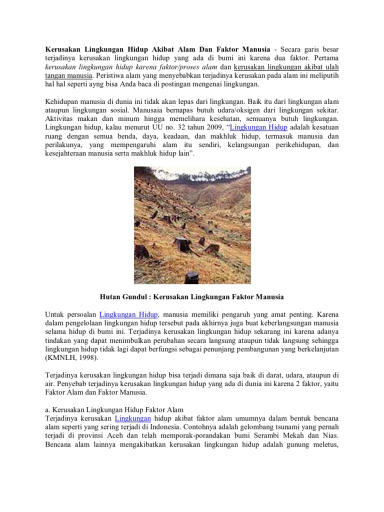 Contoh kerusakan alam akibat ulah manusia. Kerusakan lingkungan hidup adalah dampak dari alam yang telah rusak ataupun kehilangan sifat naturalnya karena sebab dari pengaruh alamiah maupun ulah manusia. Selama ada kesadaran dan kemauan dari kita saya yakin kerusakan yang sudah terjadi perlahan lahan bisa kita perbaikimari kita jaga dan lestarikan alam kita demi kelangsungan hidup kita dan untuk warisan anak cucu kita nantinya. Dan contoh kerusakan alam yang terakhir yang disebabkan oleh ulah manusia adalah pencemaran. Kerusakan yang terjadi disekitar kita tidak lain karena ulah tangan manusia tidak ada kata terlambat dalam segala hal. Kerusakan alam dan korban jiwa berjatuhan karena sifat lalai manusia. Pencemaran atau polusi biasanya terjadi karena semakin padatnya penduduk namun tidak didukung oleh bagusnya kualitas lingkungan serta tidak didukung oleh adanya aturan pemanfaatan sumber daya alam dengan bijak dan smart.