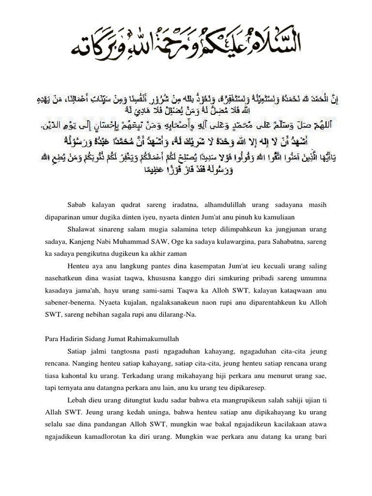 Ngalangkungan khutbah awal ieu mudah mudahan urang sadayana kalebet golongan jalmi jalmi ahli fikir jeung tafakur anu mawa kana kataqwaan nambah kana kuatna iman sarta tambah kandelna tauhid. Contoh teks khutbah jumat pertama dan kedua singkat lengkap 1 lembar pilihan tentang kejujuran kemerdekaan serta kebersihan dengan doa terbaru ini bisa menjadi kajian yang bermanfaat salah satunya yang ada pada intisari khutbah idul adha dan khutbah khutbah yang lainnya. Kumpulan khutbah jumat bhs sunda. Contoh naskah khutbah jumat bahasa sunda singkat tujuan hidup advertisement contoh khutbah jumat singkat konteks khutbah menurut konsensus para ulama fiqh disyaratkan harus memakai bahasa arab meskipun para jemaah tidak tahu artinya tapi harus meyakini bahwa yang dibawakan oleh khatib merupakan sebuah pepatah ataupun ajakan pada kebaikan dan kemaslahatan ummat. Search contoh teks khutbah jumat bahasa sunda singkat dan jelas penjelasan atau isi pembahasan dari khutbah baik itu untuk khutbah jumat idul fitri dan idul adha boleh menggunakan bahasa sesuai daerahnya masing masing misalnya orang jawa barat memakai bahasa sunda jawa timur bahasa jawa medan bahasa medan sumatera bahasa di sana atau memakain bahasa indonesia. Tidak hanya untuk khutbah jumat yang hukumnya wajib khutbah dengan teks bahasa sunda ini juga sering di gunakan pada khutbah khutbah sunnah seperti khutbah idul adha dan khutbah idul fitri.