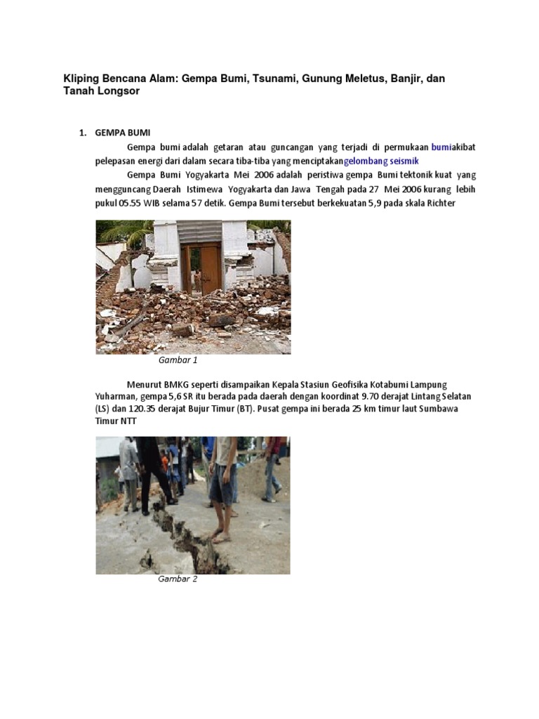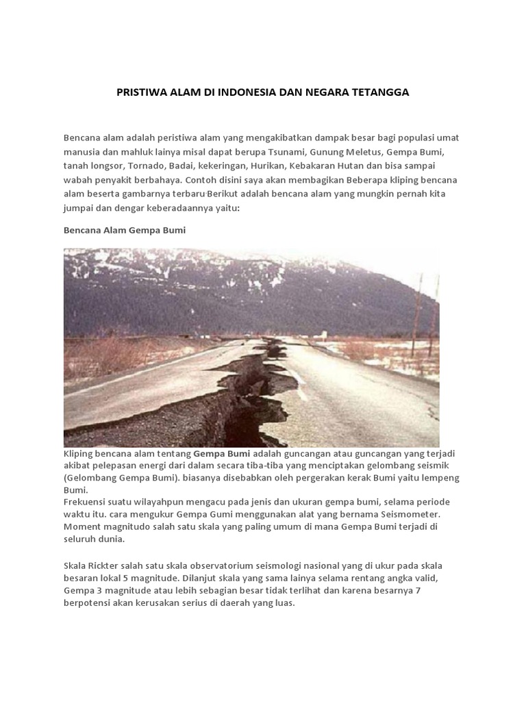 Kliping bencana alam indonesia merupakan negeri rawan bencanaselama satu dasawarsa terakhir sejarah mencatat berbagai bencana pernah melanda ibu pertiwi. Olahraga bencana alam ekonomi pkn dan lainya 11 februari 2020 16 min read contoh kliping kliping bukanlah sesuatu yang asing untuk kita istilah kliping ini sudah pernah disampaikan bahkan pada saat kita di sekolah dasar dulu. Dan bagaimanapun bentuk bencana tersebut itu sangat merugikan aktivitas manusia dan segala makhluk hidup yang ada di sekitarnya. Bencana alam gempa bumi adalah bencana alam yang disebabkan oleh tumbukan antar lempeng bumi aktivitas gunung api patahan aktif atau runtuhan batu yang mengakibatkan adanya getaran atau guncangan pada permukaan bumi. Oh iya bagi temen temen yang ingin tahu contoh kliping kliping bencana alam atau makalah tentang bencana alam bisa lihat disini. Bagus artikelnya membantu menyelesaikan tugas saya.