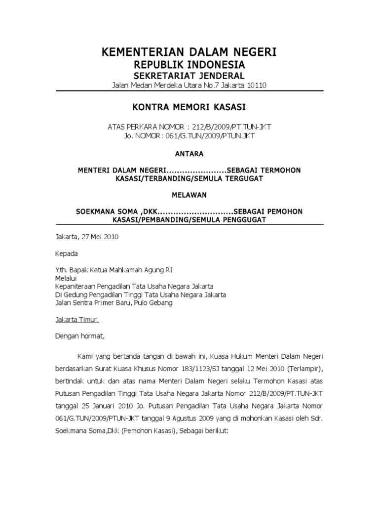 Atas alasan alasan kasasi yang disampaikan pemohon kasasi yang termohon kasasi terima pada tanggal 15 agustus 2013 maka termohon kasasi akan menyampaikan kontra memori kasasi atas memori kasasi pemohon kasasi sebagai berikut. Contoh surat kontra memori kasasi penanganan perkara perdata kemahiran perdata kemper perancang. Perlu kami jelaskan bahwa ini memori kasasi ini hanya merupakan contoh semata. Bahwa memori kasasi yang diajukan pemohon kasasijaksa penuntut umum atas putusan pengadilan negeri pekanbaru dalam perkara pidana nomor. Satu eksemplar surat kuasa khusus bukti vide t.