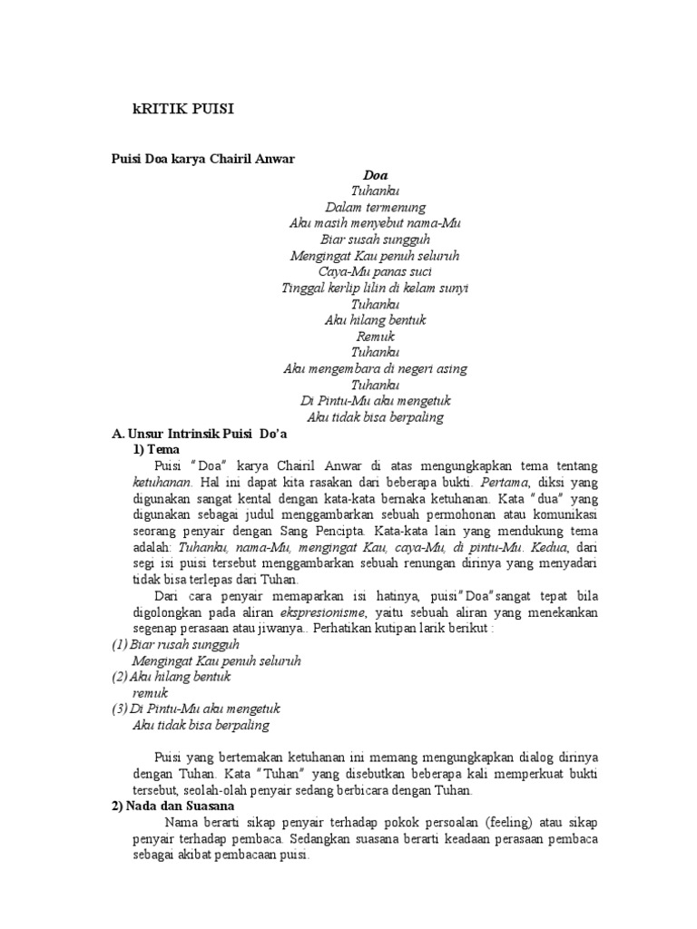 Dalam puisi sendiri karya chairil anwar ia dengan jelas menggambarkan bagaimana hidup yang ia rasakan tanpa seorang ibu. Seperti pada contoh puisi yang telah ditulis oleh rizka famela meinanda ini menggambarkan tentang perasaan cinta. Bahasa prosa seperti bahasa sehari hari. Dalam penulisan puisi ini sayangnya penyair kurang teliti ketika menuliskan huruf kapital dan juga penggunaan kata yang kurang tepat. Tak perlu sedu sedan itu. Kritik puisi puisi doa karya chairil anwar doa tuhanku dalam termenung aku masih menyebut nama mu biar susah sungguh mengingat kau penuh seluruh caya mu panas suci tinggal kerlip lilin di kelam sunyi.