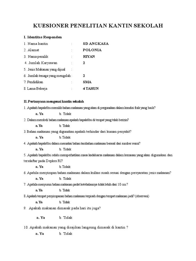 Contoh kuesioner produk makanan. Contoh kuesioner kepuasan pelanggan doc. Pengertian kuesioner angket kuesioner adalah suatu daftar pertanyaan yang harus di isi oleh responden sebagai sarana untuk mengumpulkan informasi tentang perilaku karakteristik keyakinan dan sikap sekelompok orang atau organisasi. Agar informasi yang diperoleh sesuai dan tidak menyimpang maka pertanyaan dalam kuesioner harus dipertimbangkan dengan baik. Penyebaran kuesioner dapat dilakukan secara langsung dan juga bisa melalui online. Melalui iklan produsen dapat menyampaikan manfaat tentang produk yang ditawarkannya melalui iklan. If youre not happy with the results please do another search.